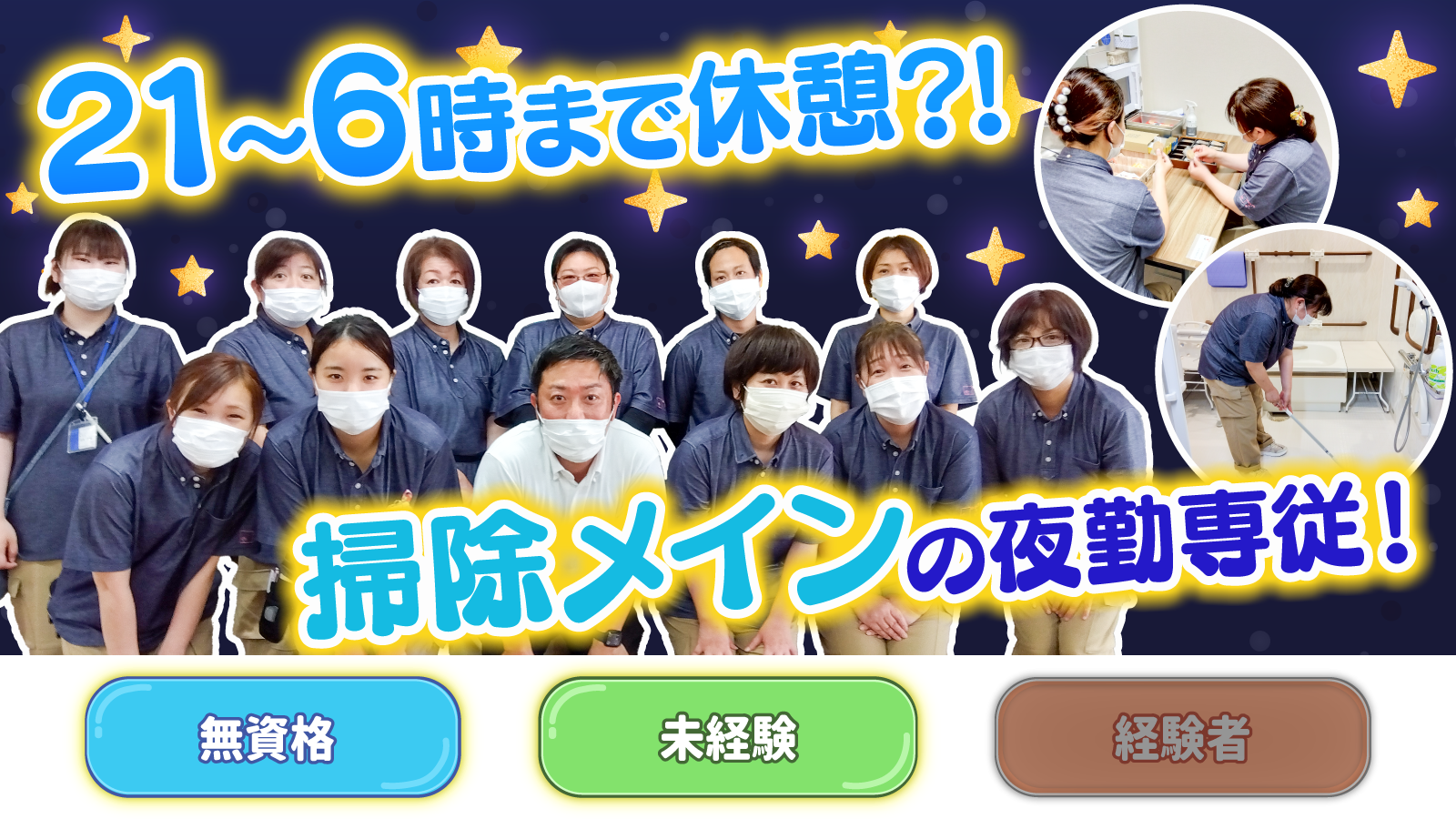 | 仕事内容 | 夜間管理員として 主に下記の業務をお任せします。 ・施設の管理 ・清掃 など |