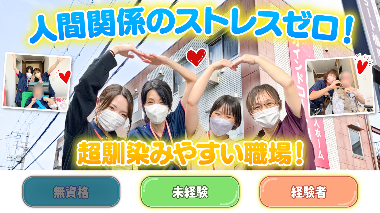 | 仕事内容 | 住宅型有料老人ホームでの 介護業務全般をお任せします。 ▼具体的には… *入浴・食事・排せつ介助 *清掃やリネン交換 *外出時の付き添い *レクリエーションの企画・実施 など |