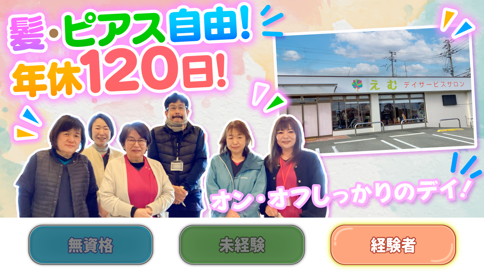 | 待遇及び福利厚生 | 社会保険完備(加入保険は法定通り) インフルエンザ予防接種費用の半額負担 健康診断費用の上限あり 資格取得支援制度 正社員登用あり 制服貸与 髪色・髪型自由 ピアス・ネイルOK(業務に支障がないもの) |