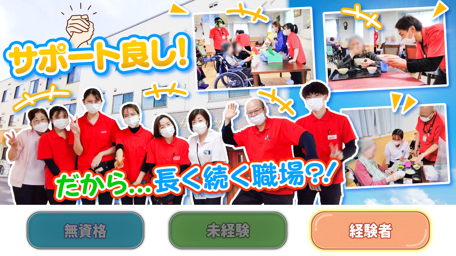 | 対象となる方 | 無資格・未経験スタートも歓迎! 資格所有者は加給あり◎ |