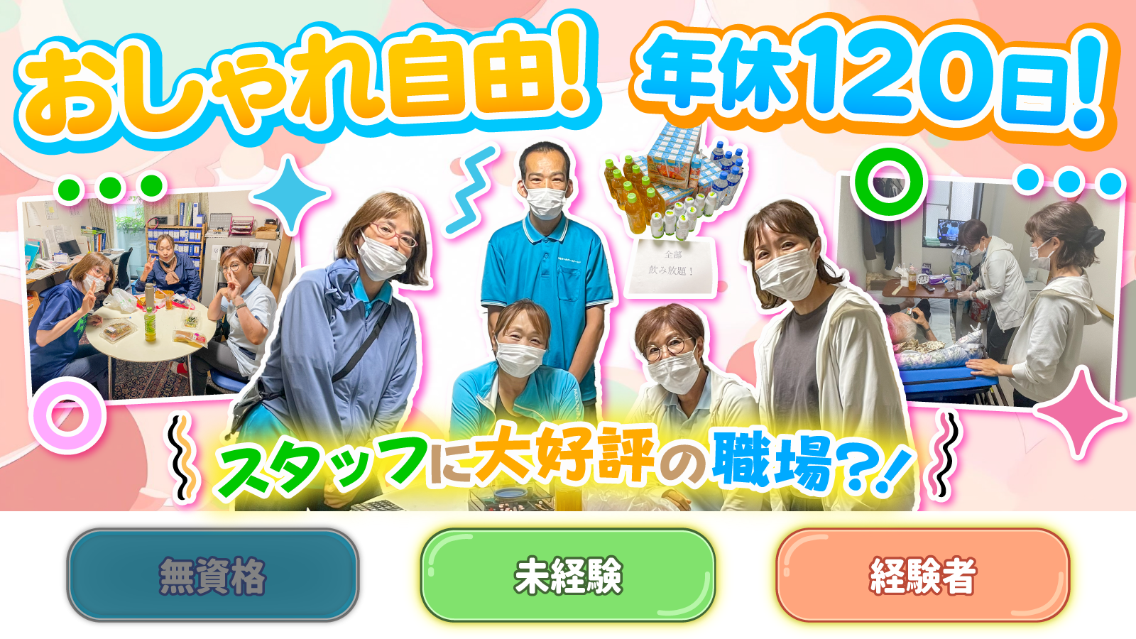 | 待遇及び福利厚生 | 社会保険完備 健康診断・インフルエンザ予防接種無料 慶弔見舞金・お祝い金 正社員登用制度 奨学金返還支援あり お菓子・ドリンクあり 誕生日プレゼントあり(クオカード) 服装自由 髪色・髪型自由 ピアスOK ネイルOK(シンプルなもの) |