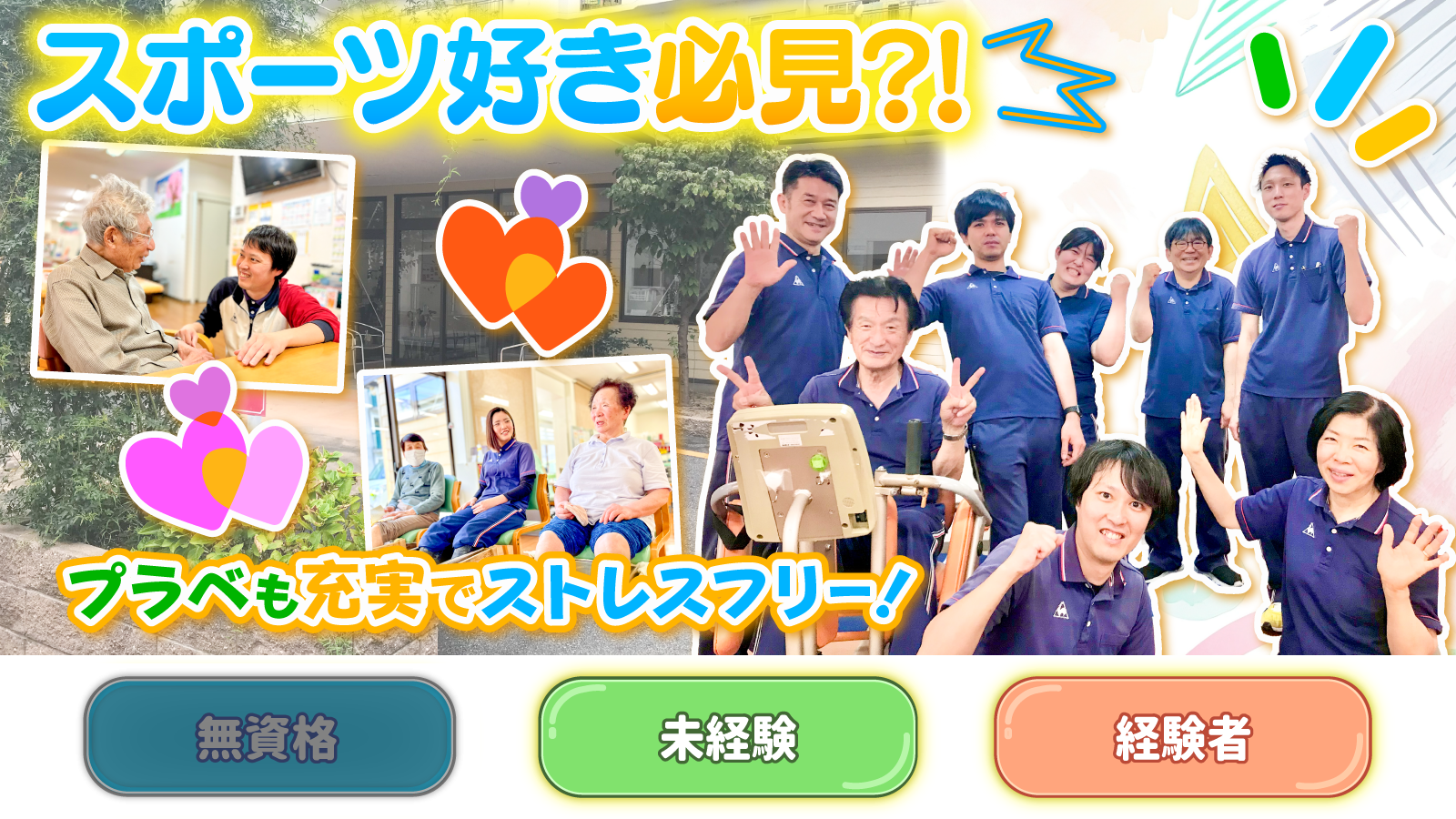 | 仕事内容 | デイサービスでの介護業務全般をお任せします。 ▼具体的には… *入浴補助 *マシン・トレーニングの指導 *運動レクやイベントの企画・実行 *個別プログラム作成 *モニタリング業務 *利用者さまの送迎 など |