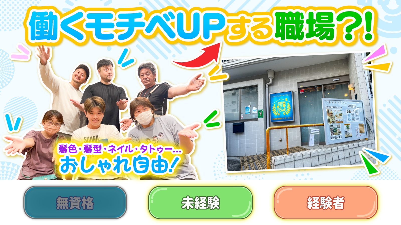 | 待遇及び福利厚生 | 社会保険完備 Wi-Fi完備 服装自由 髪型・髪色自由 ピアス・タトゥーOK ネイルOK(規定有) |