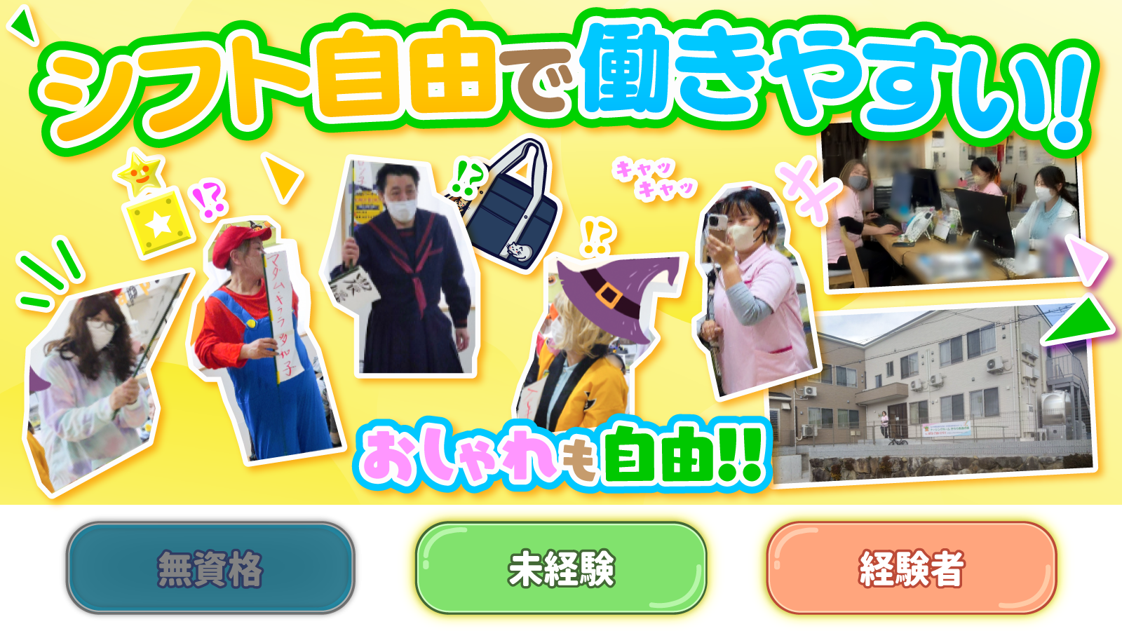 | 待遇及び福利厚生 | 社会保険完備 制服貸与(上のみ) 髪型・髪色自由 ピアスOK 食事補助あり お菓子あり Wi-Fi完備 |