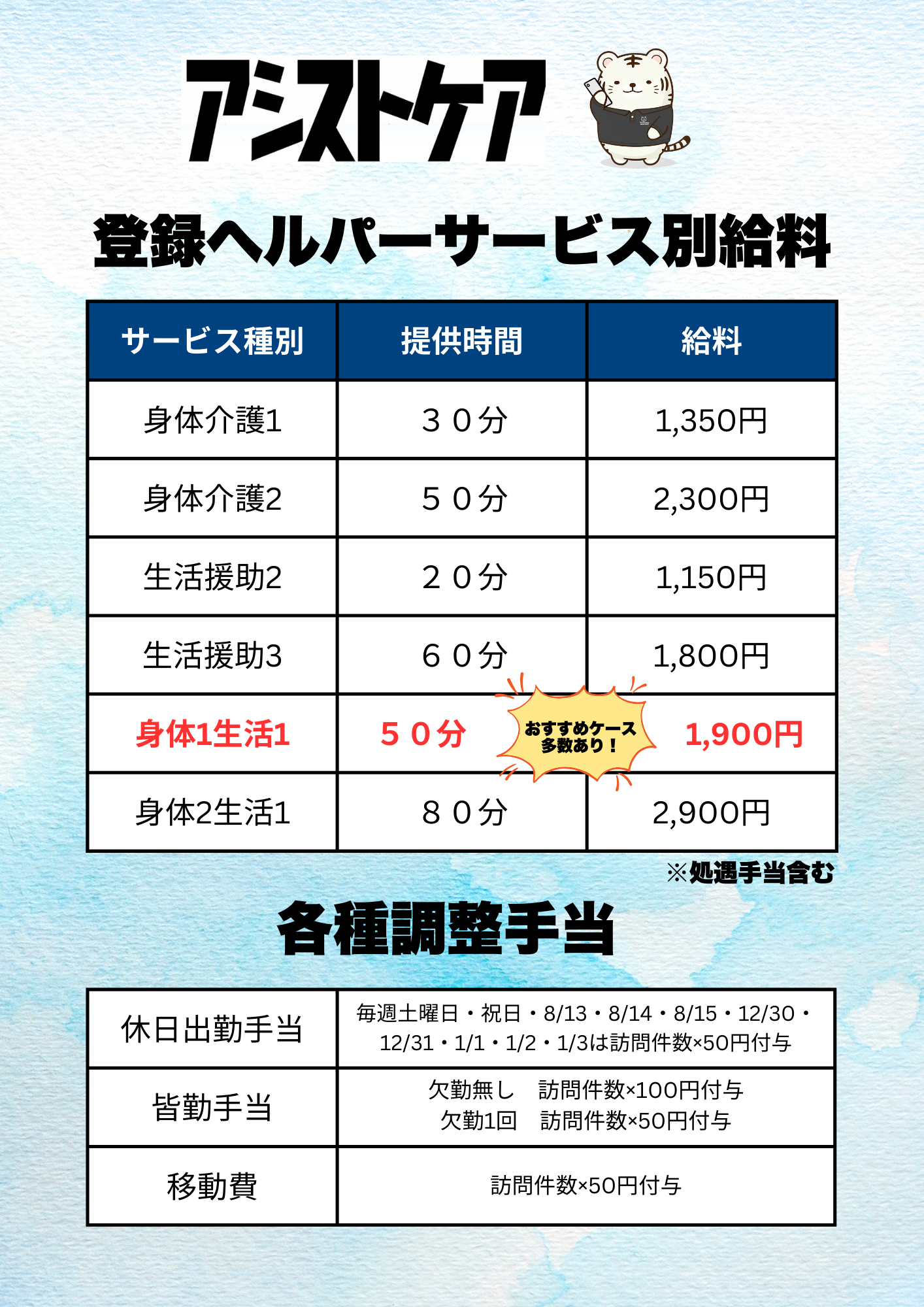 | 給与 | 時給 1,800円 ~ 訪問介護の時給は保有資格問わず一律になります。 |