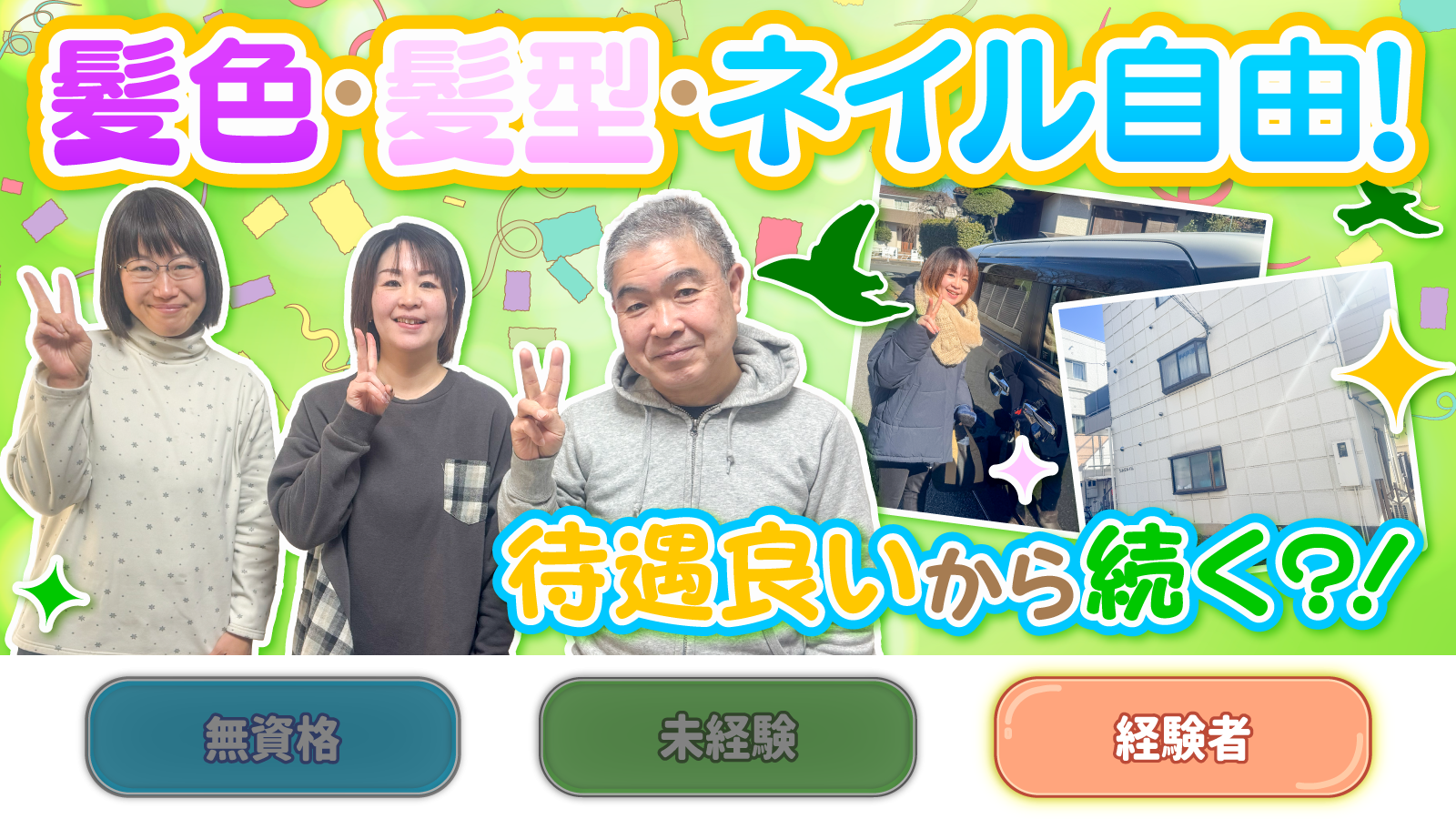 | 待遇及び福利厚生 | 社会保険完備 退職金制度 健康診断無料 資格取得支援制度 Wi-Fi完備 誕生日プレゼントあり 服装自由(規定なし) 髪色・髪型自由 ピアスOK(引っ掛からないもの) ネイルOK |