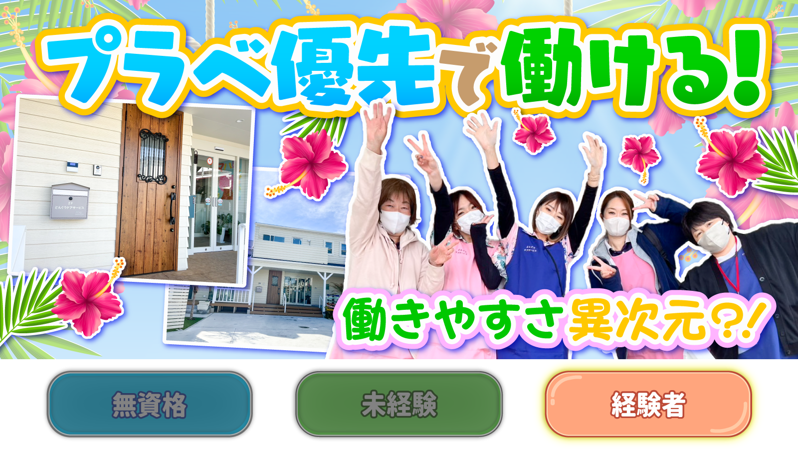 | 待遇及び福利厚生 | 社会保険完備(加入保険は法定通り) 福利厚生サービス加入 健康診断・インフルエンザ予防接種費用全額支給 資格取得支援制度 正社員登用制度 社用車貸出あり Wi-Fi完備 お菓子常備 制服支給(上のみ) 髪色・髪型自由 |