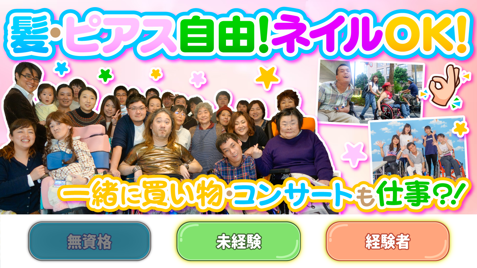 | 仕事内容 | 障害をお持ちの方の日常生活をお手伝いします。 分かりやすく言うとルームメイトです! <自宅内> 服を着る、お風呂に入る、 トイレに行く、食事を作る・食べる、 テレビをつける、部屋の掃除・洗濯など <外出> 車椅子を押す、切符を買う、 一緒に買い物・映画・コンサートに行くなど |