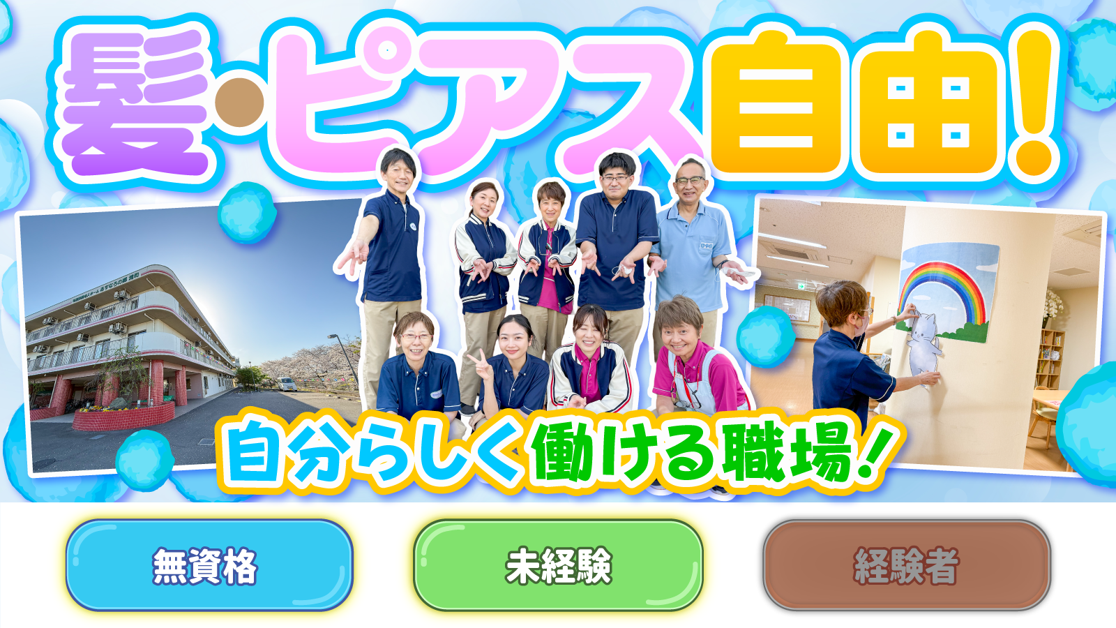 | 対象となる方 | 無資格OK <職場の構成> 女性7:男性3 |
