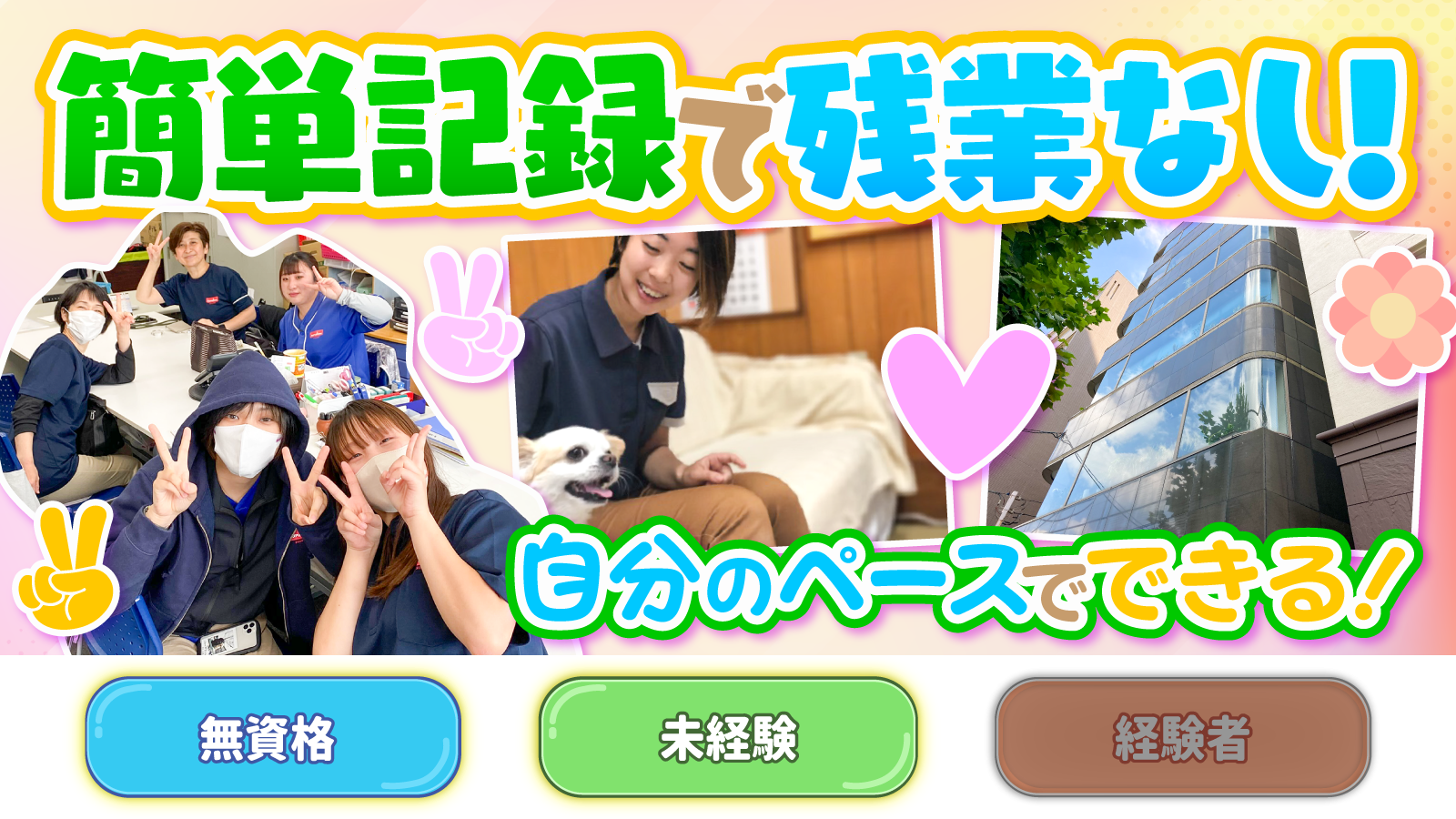 | 対象となる方 | ・無資格の方 ・初任者研修の方 <職場の人数> 女性4名、男性1名の計5名 法人全体でも女性比率が高く、 管理職も女性が多い会社です。 |